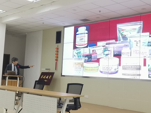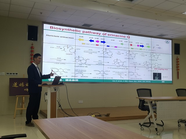 河岸洋和教授作了题为“蘑菇猴头菌中抗痴呆化合物及其它活性物质的挖掘”的报告,详细介绍了大型真菌猴头菌中子实体及菌丝体中的活性物质的发现、制备及抗老年性痴呆活性的研究,刘成伟教授作了题为“猴头菌次生代谢产物生物合成研究”的报告,给大家介绍了利用米曲霉解析猴头菌中抗老年性痴呆活性物质的生物合成的最新进展,并给大家在天然产物生物合成机理解析方面予以指导。报告后,河岸洋和教授和刘成伟教授与生物所就双方的研究方向进行了交流和讨论,并在人才培养、课题申报等方面达成了合作共识,双方将继续加深了解,明确下一步的合作方向。