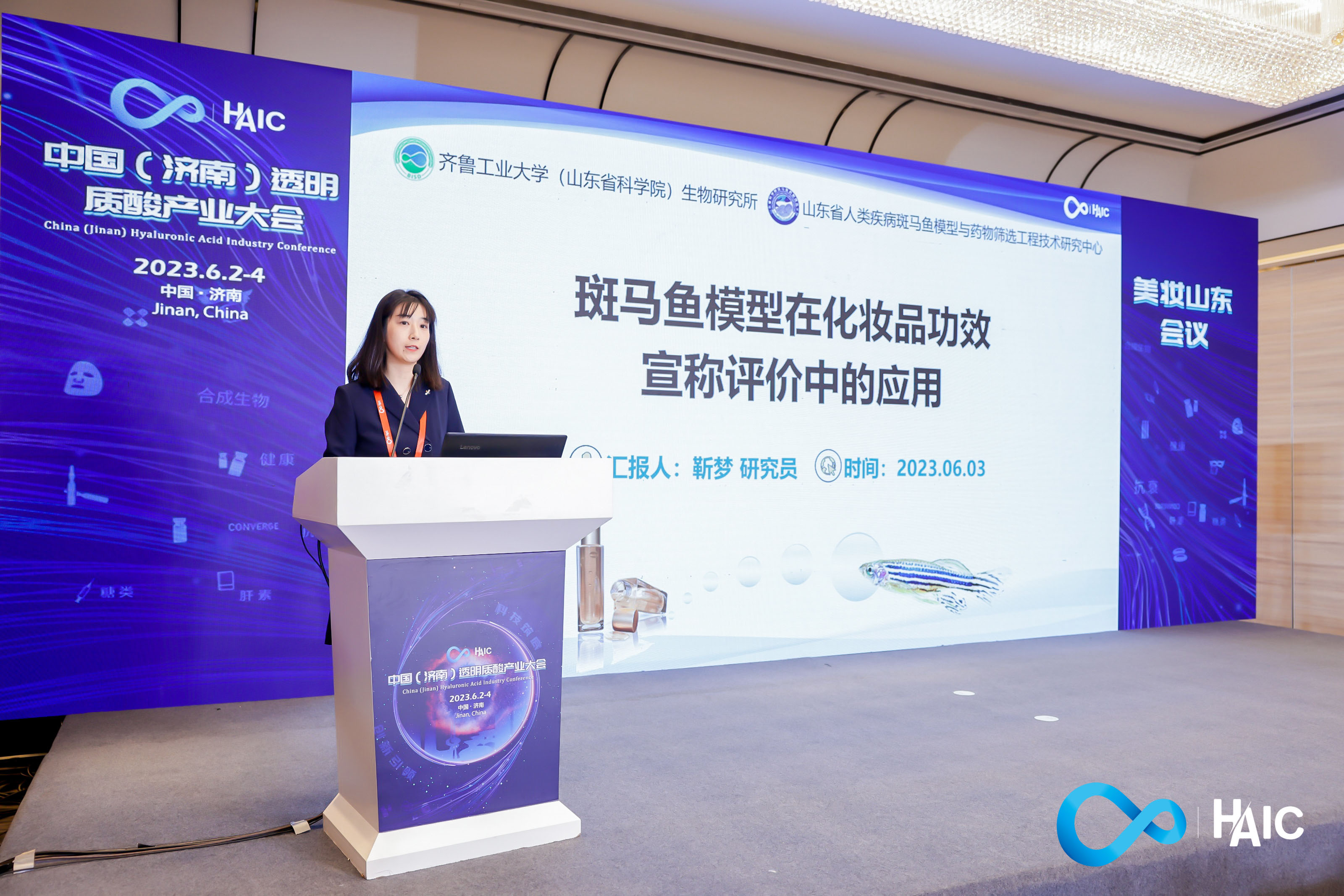 本次大会以“科技筑底·创新引领”为主题,搭建了透明质酸全产业链的权威专业交流平台。会上,靳梦以“斑马鱼模型在化妆品功效宣称评价中的应用”为题,分析了斑马鱼作为化妆品功效宣称评价模型的诸多优势,并介绍了生物研究所药物筛选平台利用斑马鱼模型开发一系列化妆品功效宣称及原料安全性评价方法和应用案例。这些方法的创建可以辅助研发过程中批量筛选配方,大大节约了时间和成本,可有效避免功效初步验证时的盲评,提高决策效率。报告后,与会人员对化妆品功效宣称评价模型与方法产生了极大的兴趣,并确定了初步的合作意向。