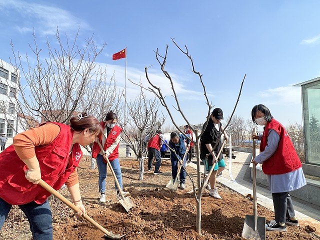 3月10日下午,为迎接第44个植树节的到来,增强广大师生保护环境的责任心,积极践行环保理念,学部志愿服务队20余人在彩石校区开展义务植树活动。