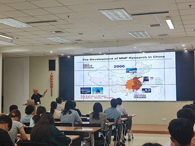 郭跃伟作了题为“蓝色无垠的海洋 创新药物的宝藏—我的30余载向海问药之旅:思源温故 展望知新”的学术报告。郭跃伟深入浅出地介绍了自己30余年来围绕海洋资源开展的天然产物发现和规模化制备、结构特别是绝对构型的鉴定、活性评价及基于功能导向的产物合成和结构改造等一系列精彩工作和科研创新过程的心路历程。随后,他分享了结合化学和生物学,以中国海洋资源为核心取得的重要研究成果,并指出了目前国内外海洋药物研发的前沿热点和广阔前景。报告结束后,参会的师生踊跃提问,郭跃伟对问题进行了一一解答。